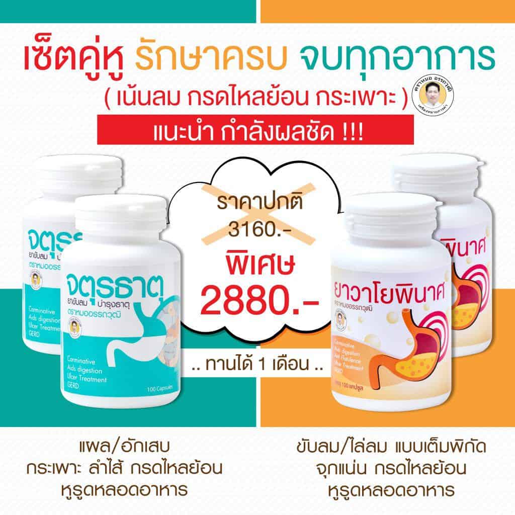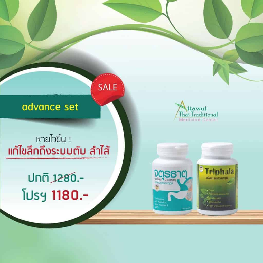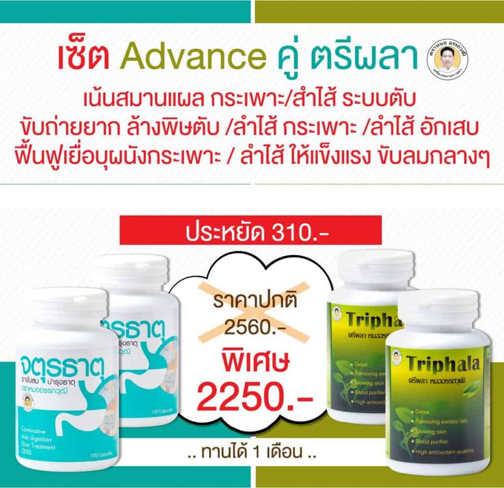 ( เซ็ตแอดวานส์ ใช้คู่ตรีผลา เพื่อสมานแผล ลดอักเสบกระเพาะ ลำไส้ ฟื้นฟูเยื่อบุผนังกระเพาะและลำไส้ให้แข็งแรง ไม่กลับเป็นซ้ำง่าย ) และ เซ็ตคู่ วาโยพินาศ กรณีแก้กษัยลม ลมตีขึ้นเบื้องสูง จุกแน่น หายใจลำบาก เจ็บเสียดที่หัวใจ ดันไปถึงหลัง อ่อนเพลีย ใจสั่น นอนไม่หลับ ฯลฯ