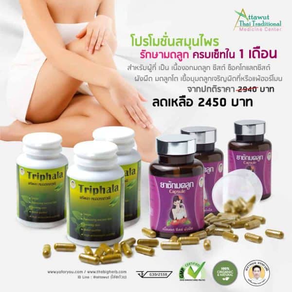 หากต้องการให้ เนื้องอกมดลูก ซีสต์ ช็อคโกแลตซีสต์ ผังผืด สลายหายไปเร็วขึ้น และ ได้ผลชัดเจนยิ่งขึ้น ให้ใช้ ร่วมกับ ตรีผลา หมออรรถวุฒิ